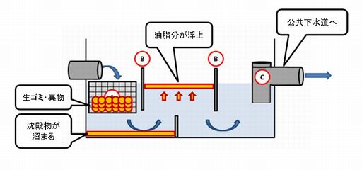 厨房排水に含まれる油脂分やゴミをグリストラップ内に留め、先の公共下水道へ流さないこと。